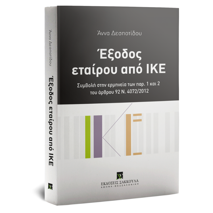 Το ανά χείρας έργο πραγματεύεται το δικαίωμα εξόδου από την ΙΚΕ και επικεντρώνεται στην έξοδο του εταίρου για σπουδαίο λόγο, με δικαστική απόφαση, η οποία εκδίδεται μετά από αίτησή του. Αυτή καθιερώνεται στο άρθρο 92 παρ. 1 του Ν. 4072/2012 και συνιστά μία από τις σημαντικότερες μεταβολές που δύνανται να επέλθουν στη σύνθεση των εταίρων κατά τη διάρκεια της εταιρικής ζωής· ενώ, αναμφίλεκτα, παρουσιάζει μεγάλο δογματικό, όσο και πρακτικό, ενδιαφέρον. Παράλληλα, εξετάζονται και οι δύο άλλες μορφές εξόδου, που προβλέπονται και ρυθμίζονται στην παρ. 2 της ίδιας διάταξης, και, ειδικότερα, α) η λεγόμενη «καταστατική» έξοδος, η οποία επιτρέπεται βάσει ρήτρας του καταστατικού και υπό τις εκεί οριζόμενες προϋποθέσεις (εδ. α΄) και β) το ιδιότυπο δικαίωμα της εταιρίας να προκαλέσει με δική της δήλωση την έξοδο εταίρου που διαθέτει μόνον μερίδια εξωκεφαλαιακής εισφοράς, εφόσον αυτός περιέλθει σε αδυναμία εκπλήρωσης της παροχής του (εδ. β΄).
