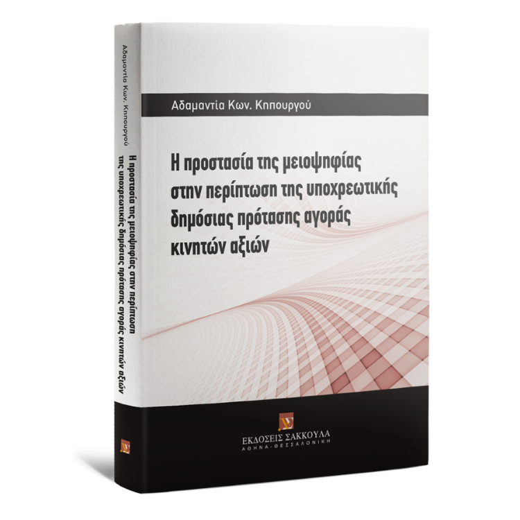 ΠΡΟΛΟΓΟΣ. ΣΥΝΤΟΜΟΓΡΑΦΙΕΣ. Ελληνικών όρων. Ξένων όρων. ΕΙΣΑΓΩΓΗ. 1. Η δημόσια πρόταση ως μέθοδος απόκτησης του ελέγχου «εισηγμένης» ΑΕ. 2. Η δημόσια πρόταση ως μέσο προστασίας της μειοψηφίας μετά την απόκτηση του ελέγχου «εισηγμένης» ΑΕ. 3. Μεθοδολογικές παρατηρήσεις. ΓΕΝΙΚΟ ΜΕΡΟΣ Η ΠΡΟΣΤΑΣΙΑ ΤΗΣ ΜΕΙΟΨΗΦΙΑΣ «ΕΙΣΗΓΜΕΝΗΣ» ΑΕ ΣΕ ΠΕΡΙΠΤΩΣΗ ΑΛΛΑΓΗΣ ΤΟΥ ΦΟΡΕΑ ΕΛΕΓΧΟΥ ΤΗΣ Κεφάλαιο Το πρόβλημα της προστασίας της μειοψηφίας ΤΜΗΜΑ ΤΟ ΣΥΜΦΕΡΟΝ ΤΟΥ ΜΕΤΟΧΟΥ ΕΠΕΝΔΥΤΗ ΩΣ ΑΝΤΙΚΕΙΜΕΝΟ ΠΡΟΣΤΑΣΙΑΣ § 1. Η μειοψηφία στην «εισηγμένη» ΑΕ. Α. Η ανώνυμη εταιρία υπό το πρίσμα της λειτουργίας της κεφαλαιαγοράς. Β. Τα ποιοτικά χαρακτηριστικά της μειοψηφίας. § 2. Η απειλή των συμφερόντων της μειοψηφίας «εισηγμένης» ΑΕ από την αλλαγή του φορέα ελέγχου της. Α. Το ενδεχόμενο αλλαγής της πολιτικής των επενδύσεων. Β. Το ενδεχόμενο έμμεσης διαγραφής των μετοχών της εταιρίας από το χρηματιστήριο (cold delisting). Γ. Το ενδεχόμενο εξαγοράς της εταιρίας από ανταγωνίστριά της με σκοπό τη λεηλασία της εταιρικής περιουσίας και στη συνέχεια τη διάλυση της εταιρίας. ΤΜΗΜΑ Η ΑΝΑΓΚΗ ΠΡΟΒΛΕΨΗΣ ΕΙΔΙΚΗΣ ΠΡΟΣΤΑΣΙΑΣ ΤΗΣ ΜΕΙΟΨΗΦΙΑΣ «ΕΙΣΗΓΜΕΝΗΣ» ΑΕ ΛΟΓΩ ΤΩΝ ΠΟΙΟΤΙΚΩΝ ΧΑΡΑΚΤΗΡΙΣΤΙΚΩΝ ΤΗΣ § 3. Προς ένα ειδικό δίκαιο «εισηγμένων» εταιριών με γνώμονα την προστασία του επενδυτή και την κατ’ επέκταση επίτευξη κοινωνικοοικονομικών στόχων. § 4. Η συμβολή των μέσων του κοινού δικαίου. Α. Η θεμελίωση ευθύνης του μεταβιβάζοντος τον έλεγχο στην υποχρέωση πίστης του μετόχου. Β. Η νομική κατασκευή ευθύνης του μεταβιβάζοντος τον έλεγχο ως λύση περιορισμένης αποτελεσματικότητας για την προστασία της μειοψηφίας των επενδυτών. Κεφάλαιο Η υποχρεωτική δημόσια πρόταση αγοράς κινητών αξιών ως θεσμός του δικαίου της κεφαλαιαγοράς για την εξασφάλιση της προστασίας της μειοψηφίας ΤΜΗΜΑ ΠΕΡΙΟΡΙΣΜΟΣ ΤΗΣ ΣΥΜΒΑΤΙΚΗΣ ΕΛΕΥΘΕΡΙΑΣ ΠΡΟΣ ΤΟΝ ΣΚΟΠΟ ΤΗΣ ΠΡΟΣΤΑΣΙΑΣ ΤΗΣ ΜΕΙΟΨΗΦΙΑΣ § 5. Η υποχρέωση υποβολής δημόσιας πρότασης αγοράς ή αλλιώς αναγκαστική σύμβαση. § 6. Η υποχρέωση υποβολής δημόσιας πρότασης αγοράς προς όλους τους κατόχους κινητών αξιών και για το σύνολο των αξιών τους. § 7. Η υποχρέωση αγοράς σε καθορισμένη τιμή. ΤΜΗΜΑ ΤΟ ΝΟΜΟΘΕΤΙΚΟ ΕΡΕΙΣΜΑ ΤΗΣ ΥΠΟΧΡΕΩΤΙΚΗΣ ΔΗΜΟΣΙΑΣ ΠΡΟΤΑΣΗΣ ΑΓΟΡΑΣ ΚΙΝΗΤΩΝ ΑΞΙΩΝ § 8. Νομική βάση. Α. Η ανατροπή του δικαιοπρακτικού θεμελίου. Β. Η αρχή της ισότητας. § 9. Οικονομική βάση. ΕΙΔΙΚΟ ΜΕΡΟΣ Η ΑΠΟΤΕΛΕΣΜΑΤΙΚΟΤΗΤΑ ΤΗΣ ΡΥΘΜΙΣΗΣ ΤΗΣ ΥΠΟΧΡΕΩΤΙΚΗΣ ΔΗΜΟΣΙΑΣ ΠΡΟΤΑΣΗΣ ΑΓΟΡΑΣ ΚΙΝΗΤΩΝ ΑΞΙΩΝ ΣΤΟ ΕΛΛΗΝΙΚΟ ΔΙΚΑΙΟ (Ν. 3461/30.05.2006) ΕΝΟΤΗΤΑ ΠΡΩΤΗ Ο μηχανισμός προστασίας της μειοψηφίας. Κεφάλαιο Οι προϋποθέσεις για τη γένεση της υποχρέωσης υποβολής δημόσιας πρότασης ΤΜΗΜΑ Η ΥΠΕΡΒΑΣΗ ΤΩΝ ΚΡΙΣΙΜΩΝ ΟΡΙΩΝ § 10. Η υπέρβαση του ορίου του 1/3 του συνόλου των δικαιωμάτων ψήφου της υπό εξαγορά εταιρίας. Α. Τα μειονεκτήματα των προγενέστερων του Ν. 3461/2006 επιλογών. 1. Η υπέρβαση του ορίου του 50% του συνόλου των δικαιωμάτων ψήφου στις Αποφάσεις της Επιτροπής Κεφαλαιαγοράς. 2. Η έλλειψη ειδικής πρόβλεψης στην Οδηγία 2004/25/ΕΚ. Β. Η επιλογή του έλληνα νομοθέτη στην κατεύθυνση της διασφάλισης της προστασίας των κατόχων μειοψηφικών συμμετοχών. § 11. Η υπέρβαση του ορίου του 3% μέσα σε έξι μήνες από πρόσωπο που κατέχει ήδη περισσότερο από το 1/3 χωρίς να υπερβαίνει το 1/2 του συνόλου των δικαιωμάτων ψήφου της υπό εξαγορά εταιρίας. Α. Η διασφάλιση της απρόσκοπτης εκδήλωσης δημοσίων προτάσεων και η μέσω αυτής επίτευξη υπεραξιών για το σύνολ