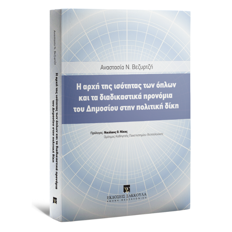 Το βιβλίο αυτό καλύπτει ένα κενό της ελληνικής βιβλιογραφίας, προσεγγίζοντας μονογραφικά την αρχή της ισότητας των όπλων στο πλαίσιο της πολιτικής δίκης. Στόχος της μελέτης είναι να αναδειχθεί η συμβολή της θεμελιώδους αυτής αρχής στην πραγμάτωση του κράτους δικαίου, αλλά και να καταδειχθούν οι πλείστες δυστυχώς παραβιάσεις της σε επίπεδο διαδικαστικών προνομίων του Δημοσίου.