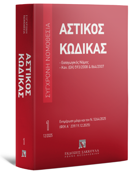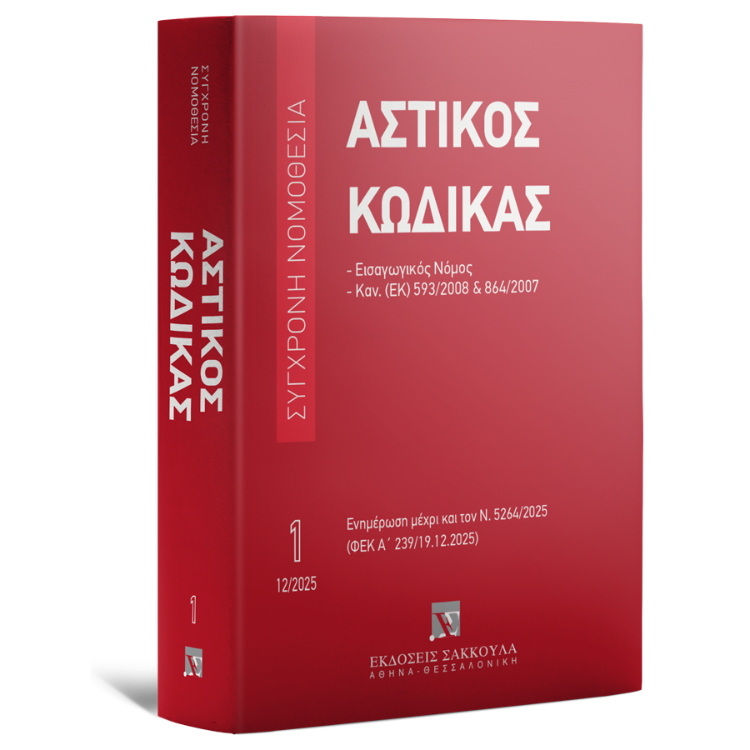 Ο Αστικός Κώδικας της σειράς «Σύγχρονη Νομοθεσία» είναι ενημερωμένος με όλες τις πρόσφατες τροποποιήσεις, έως και τους Νόμους 3719/2008 (ΦΕΚ Α΄ 241/26.11.2008), 3853/2010 (ΦΕΚ Α΄ 90/17.6.2010), 4055/2012 (ΦΕΚ Α΄ 51/12.3.2012), 4077/2012 (ΦΕΚ Α΄ 168/31.8.2012), 4139/2013 (ΦΕΚ Α΄ 74/20.3.2013), 4182/2013 (ΦΕΚ Α΄ 185/10.9.2013), 4268/2014 (ΦΕΚ Α΄ 141/27.6.2014), 4272/2014 (ΦΕΚ Α΄ 145/11.7.2014), 4356/2015 (ΦΕΚ Α΄ 181/24.12.2015), 4509/2017 (ΦΕΚ Α΄ 201/22.12.2017), 4611/2019 (ΦΕΚ Α΄ 73/17.5.2019), 4714/2020 (ΦΕΚ Α΄ 148/31.7.2020), 4727/2020 (ΦΕΚ Α΄ 184/23.9.2020), 4745/2020 (ΦΕΚ Α΄ 214/6.11.2020), 4786/2021 (ΦΕΚ Α΄ 43/23.3.2021), 4800/2021 (ΦΕΚ Α΄ 81/21.5.2021), 4837/2021 (ΦΕΚ Α΄ 178/1.10.2021), 4958/2022 (ΦΕΚ Α΄ 142/21.7.2022), 4967/2022 (ΦΕΚ Α΄ 171/9.9.2022), 5023/2023 (ΦΕΚ Α΄ 34/17.2.2023), 5089/2024 (ΦΕΚ Α΄ 24/16.2.2024), 5095/2024 (ΦΕΚ Α΄ 40/15.3.2024), 5197/2025 (ΦΕΚ Α΄ 76/16.5.2025), 5221/2025 (ΦΕΚ Α΄ 133/28.7.2025), 5259/2025 (ΦΕΚ Α΄ 228/12.12.2025) και 5624/2025 (ΦΕΚ Α΄ 239/19.12.2025).