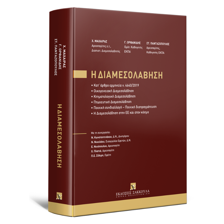 Με το παρόν έργο καταβάλλεται μια προσπάθεια συνολικής θεωρήσεως του θεσμού της διαμεσολαβήσεως, ο οποίος έχει καταστεί υποχρεωτικός για την εκδίκαση του μεγαλύτερου τμήματος των αστικών διαφορών. Ειδικότερα, αντιμετωπίζεται υπό μορφή υπομνηματιστικής προσέγγισης ο οικείος νόμος 4640/2019, όπως επίσης η διαμεσολάβηση στους πρακτικώς σημαντικούς τομείς των οικογενειακών και κτηματολογικών διαφορών, του δικαίου της εξυγιάνσεως και της ποινικής δικαιοσύνης. Εξετάζονται, παράλληλα, οι διαφορετικές μορφές της διαμεσολαβήσεως, όπως αποτυπώνονται ιδίως στον ΚΠολΔ, καθώς και ο θεσμός της διαμεσολαβήσεως στις διασυνοριακές διαφορές στο πλαίσιο κανονιστικών πρωτοβουλιών της Ευρωπαϊκής Ενώσεως. Νομολογία και θεωρία, ημεδαπή και αλλοδαπή, συνεκτιμώνται στο μέτρο του δυνατού και στον βαθμό που είναι αναγκαίο, ενώ τμήματα του έργου παρουσιάζουν μία μονογραφική διάσταση.