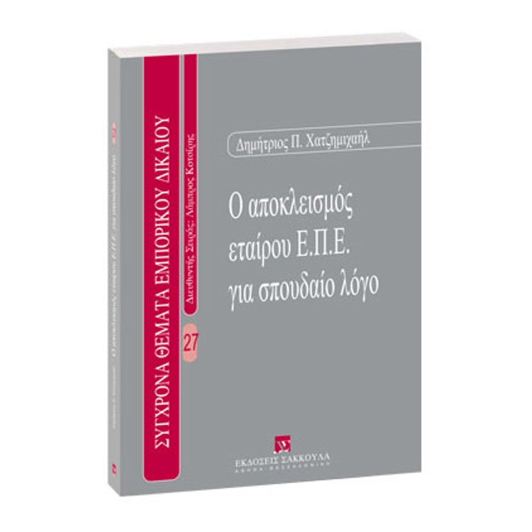 Πρόκειται για μονογραφία εστιασμένη στη συστηματική ανάλυση της ρύθμισης που αναφέρεται στον αποκλεισμό του εταίρου στο δίκαιο της ΕΠΕ. Η εξέταση της ρύθμισης αυτής γίνεται υπό το πρίσμα του δισυπόστατου χαρακτήρα της, διότι αν και πρόκειται για ένα εταιρικό δικαίωμα που αποσκοπεί στην αποκατάσταση της εύρυθμης λειτουργίας της εταιρίας, εξεταζόμενο από την πλευρά του αποκλειομένου εταίρου, οδηγεί στην πρόωρη και ακούσια κατάλυση της εταιρικής του ιδιότητας. Το βιβλίο αποτελείται από ένα εισαγωγικό μέρος, δύο κύρια κεφάλαια, και ολοκληρώνεται με αναφορά στα συμπεράσματα και τις εκτιμήσεις νομοθετικής πολιτικής.