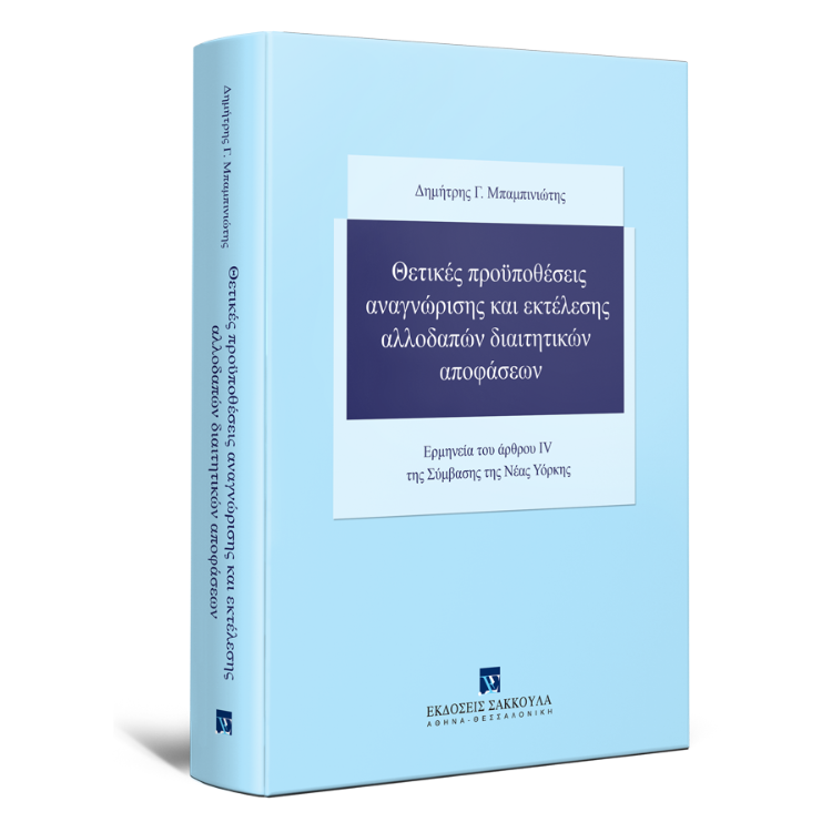 Στο παρόν έργο εξετάζονται οι θετικές προϋποθέσεις αναγνώρισης και εκτέλεσης των αλλοδαπών διαιτητικών αποφάσεων, έτσι όπως αυτές διέπονται από το άρθρο IV της Σύμβασης της Νέας Υόρκης της 10ης Ιουνίου 1958, η οποία έχει κυρωθεί από την Ελλάδα ήδη με το ν.δ. 4220/1961. Η εφαρμογή του άρθρου IV γεννά ένα πλήθος επιμέρους ερμηνευτικών ζητημάτων με σημαντικές πρακτικές συνέπειες και προεκτάσεις. Το ως άνω κενό εκτενούς θεωρητικής επεξεργασίας του άρθρου IV φιλοδοξεί να καλύψει το παρόν έργο.
