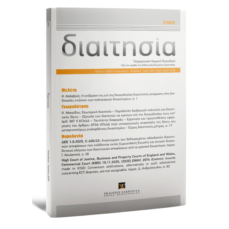 Κ. Μακρίδου, Εσωτερική διαιτησία – Παράλληλη διεξαγωγή πολιτικής και διαιτητικής δίκης – Εξουσία των διαιτητών να κρίνουν επί της δικαιοδοσίας τους κατ’ άρθ. 887 ΙΙ ΚΠολΔ – Ταυτότητα διαφοράς – Ερμηνεία και προϋποθέσεις εφαρμογής του άρθρου 870Α ΚΠολΔ περί υποχρεωτικής αναστολής της δίκης του μεταγενεστέρως επιληφθέντος δικαστηρίου – Εύρος διαιτητικής ρήτρας, σ. 17