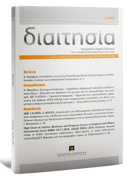 ΔΕΕ 1.8.2025, C-600/23: Αναγνώριση του δεδικασμένου αλλοδαπών διαιτητικών αποφάσεων που εκδίδονται εκτός Ευρωπαϊκής Ένωσης και έκταση δικαιοδοτικού ελέγχου των διαιτητικών αποφάσεων από τα κρατικά δικαστήρια, παρατ. Ί. Ντολαπτσή, σ. 38