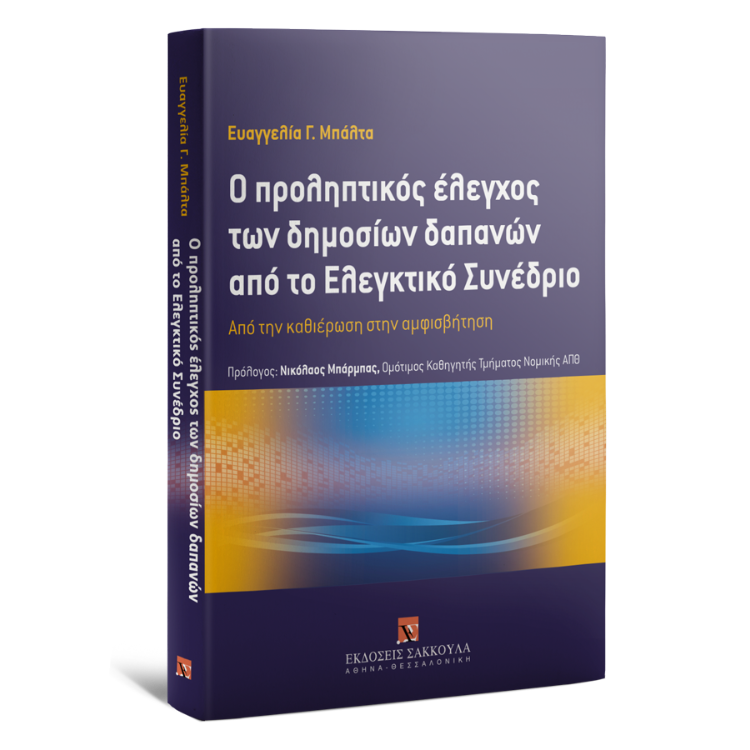 Το παρόν έργο πραγματεύεται με ολοκληρωμένο και συστηματικό τρόπο την άσκηση προληπτικού ελέγχου των δημοσίων δαπανών από το Ελεγκτικό Συνέδριο, ζήτημα το οποίο σε περίοδο δημοσιονομικής κρίσης καθίσταται ιδιαίτερα επίκαιρο. Πρόκειται για ένα έργο που επιδιώκει να εμπλουτίσει την υπάρχουσα περιορισμένη ελληνική βιβλιογραφία στον τομέα του δημοσιονομικού δικαίου, ο οποίος διεκδικεί επάξια τη χειραφέτηση και ανάπτυξή του ως αυτόνομου κλάδου δικαίου.