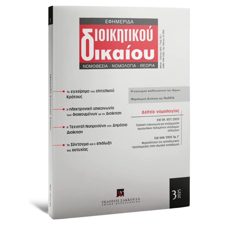Για να αποκτήσετε συνδρομή στο περιοδικό 'Εφημερίδα Διοικητικού Δικαίου', παρακαλούμε επικοινωνήστε με ένα από τα καταστήματά μας (Αθήνα: 210 33 87 500, Θεσσαλονίκη: 2310 535 381) ή αποστείλατε e-mail στο info@sakkoulas.gr