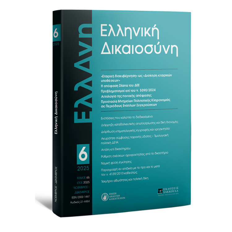 Για να αποκτήσετε συνδρομή στο περιοδικό 'Ελληνική Δικαιοσύνη', παρακαλούμε επικοινωνήστε με ένα από τα καταστήματά μας (Αθήνα: 210 33 87 500, Θεσσαλονίκη: 2310 535 381) ή αποστείλατε e-mail στο info@sakkoulas.gr