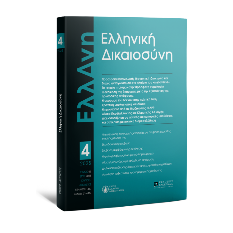 Για να αποκτήσετε συνδρομή στο περιοδικό 'Ελληνική Δικαιοσύνη', παρακαλούμε επικοινωνήστε με ένα από τα καταστήματά μας (Αθήνα: 210 33 87 500, Θεσσαλονίκη: 2310 535 381) ή αποστείλατε e-mail στο info@sakkoulas.gr