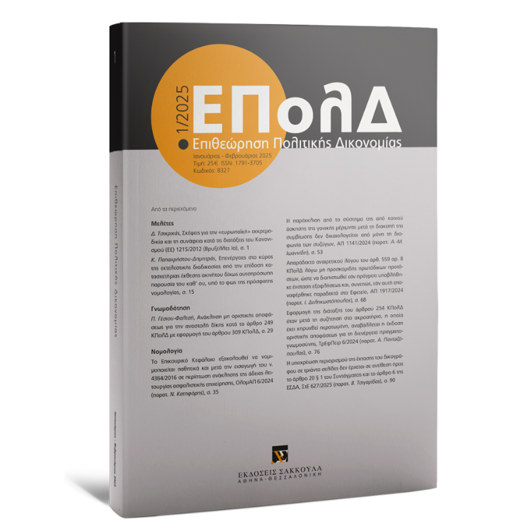 Για να αποκτήσετε συνδρομή στο περιοδικό 'Επιθεώρηση Πολιτικής Δικονομίας', παρακαλούμε επικοινωνήστε με ένα από τα καταστήματά μας (Αθήνα: 210 33 87 500, Θεσσαλονίκη: 2310 535 381) ή αποστείλατε e-mail στο info@sakkoulas.gr