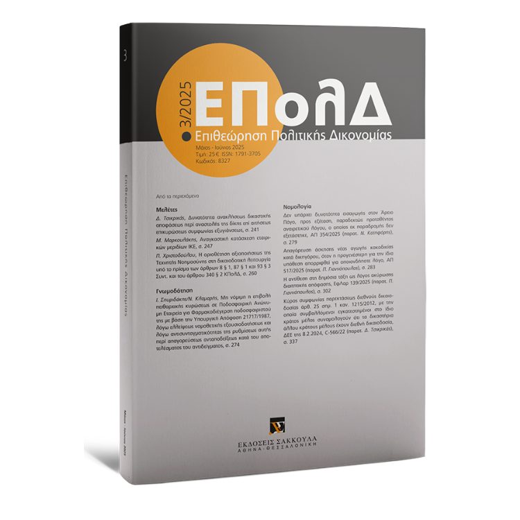 Για να αποκτήσετε συνδρομή στο περιοδικό 'Επιθεώρηση Πολιτικής Δικονομίας', παρακαλούμε επικοινωνήστε με ένα από τα καταστήματά μας (Αθήνα: 210 33 87 500, Θεσσαλονίκη: 2310 535 381) ή αποστείλατε e-mail στο info@sakkoulas.gr