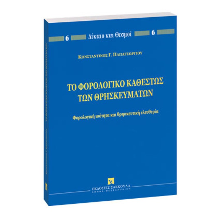 Με το έργο αυτό επιχειρείται, για πρώτη φορά στη χώρα μας, η συνολική μελέτη της ειδικής – κατά κανόνα απαλλακτικής – φορολογικής μεταχειρίσεως, την οποία απολαύουν τα γνωστά θρησκεύματα. Προς το σκοπό αυτόν εξετάζονται, μετά από συνταγματική θεώρηση του όλου ζητήματος (Κεφάλαιο Πρώτο), οι σχετικές με τα θρησκεύματα ρυθμίσεις κάθε κατηγορίας φορολογίας (Εισοδήματος, Μεγάλης Ακίνητης Περιουσίας, Μεταβιβάσεων, Κληρονομιών και Δωρεών, Φ.Π.Α., Ειδικών Φόρων Κατανάλωσης, Τελωνειακών Δασμών, Φόρων υπέρ Ο.Τ.Α., Φόρων υπέρ Τρίτων), με πλήρη βιβλιογραφική και νομολογιακή τεκμηρίωση (Κεφάλαιο Δεύτερο).