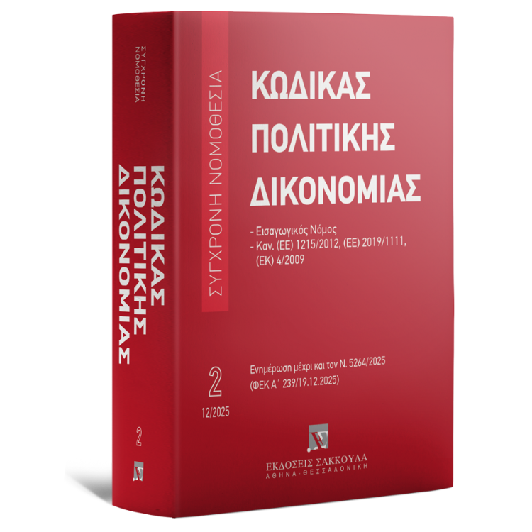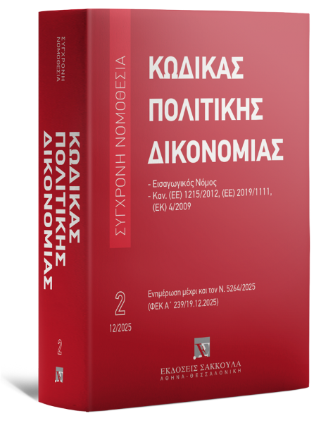 Ο Νέος Κώδικας Πολιτικής Δικονομίας και ο ΕισΝΚΠολΔ της σειράς «Σύγχρονη Νομοθεσία» είναι ενημερωμένοι με όλες τις τροποποιήσεις που επέφεραν οι Ν. 4335/2015 (ΦΕΚ Α΄ 23.7.2015), 4342/2015 (ΦΕΚ Α΄ 143/9.11.2015), 4356/2015 (ΦΕΚ Α΄ 181/24.12.2015), 4370/2016 (ΦΕΚ Α΄ 37/7.3.2016), 4411/2016 (ΦΕΚ Α΄ 142/3.8.2016), 4446/2016 (ΦΕΚ Α΄ 240/22.12.2016), 4472/2017 (ΦΕΚ Α΄ 74/19.5.2017), 4475/2017 (ΦΕΚ Α΄ 83/12.6.2017), 4488/2017 (ΦΕΚ Α΄ 137/13.9.2017), 4491/2017 (ΦΕΚ Α΄ 152/13.10.2017), 4509/2017 (ΦΕΚ Α΄ 201/22.12.2017), 4512/2018 (ΦΕΚ Α΄ 5/17.1.2018), 4549/2018 (ΦΕΚ Α΄ 105/14.6.2018), 4604/2019 (ΦΕΚ Α΄ 50/26.3.2019), 4640/2019 (ΦΕΚ Α΄ 190/30/11/2019), 4689/2020 (ΦΕΚ Α΄ 103/27.5.2020), 4690/2020 (ΦΕΚ Α΄ 104/30.5.2020), 4700/2020 (ΦΕΚ Α΄ 127/29.6.2020), 4727/2020 (ΦΕΚ Α΄ 184/23.9.2020), 4745/2020 (ΦΕΚ Α΄ 214/6.11.2020), 4842/2021 (ΦΕΚ Α΄ 190/13.10.2021), 4855/2021 (ΦΕΚ Α΄ 215/12.11.2021), 4871/2021 (ΦΕΚ Α΄ 246/10.12.2021), 4912/2022 (ΦΕΚ Α΄ 59/17.3.2022), 4937/2022 (ΦΕΚ Α΄ 106/2.6.2022), 4938/2022 (ΦΕΚ Α΄ 109/6.6.2022), 4947/2022 (ΦΕΚ Α΄ 124/23.6.2022), 4963/2022 (ΦΕΚ Α΄ 149/30.7.2022), 4990/2022 (ΦΕΚ Α΄ 210/11.11.2022), 5016/2023 (ΦΕΚ Α΄ 21/4.2.2023), 5023/2023 (ΦΕΚ Α΄ 34/17.2.2023), 5095/2024 (ΦΕΚ Α΄ 40/15.3.2024), 5108/2024 (ΦΕΚ Α΄ 65/2.5.2024), 5130/2024 (ΦΕΚ Α΄ 127/1.8.2024), 5134/2024 (ΦΕΚ Α΄ 146/11.9.2024), 5151/2024 (ΦΕΚ Α΄ 173/4.11.2024), 5193/2025 (ΦΕΚ Α΄ 56/11.4.2025), 5221/2025 (ΦΕΚ Α΄ 133/28.7.2025), Ν. 5259/2025 (ΦΕΚ Α΄ 228/12.12.2025) και 5624/2025 (ΦΕΚ Α΄ 239/19.12.2025).