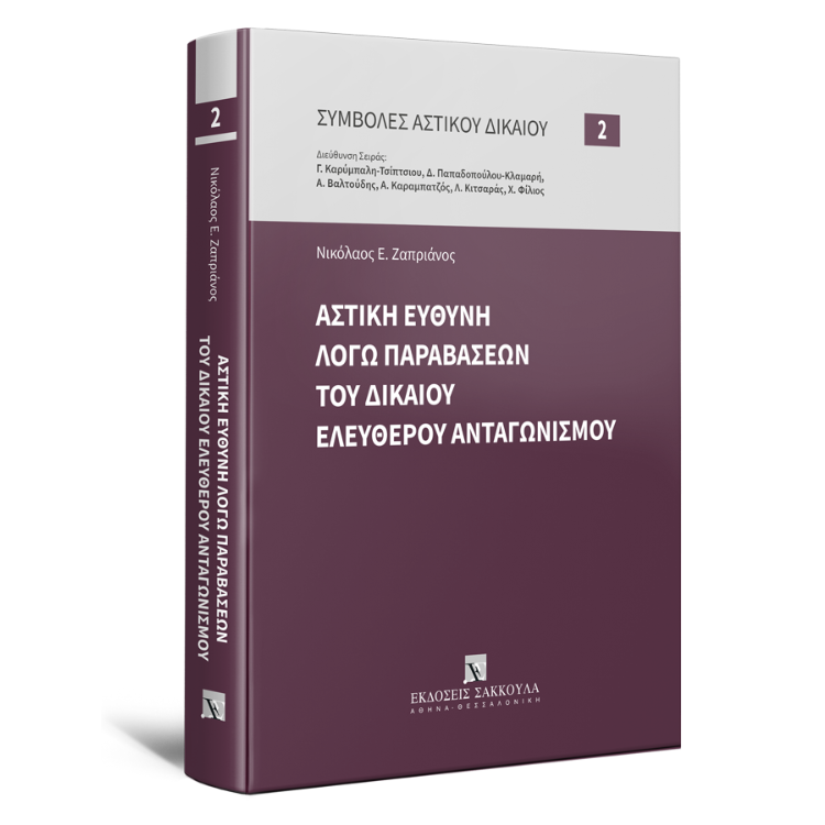 Ο πρόσφατος ν. 4529/2018 και η νομολογιακή δραστηριότητα των τελευταίων ετών καταδεικνύουν την αυξανόμενη σημασία της αστικής ευθύνης επί παραβάσεων του εθνικού και ενωσιακού δικαίου του ελεύθερου ανταγωνισμού. Η παρούσα μελέτη αποτελεί την πρώτη μονογραφική επεξεργασία του ζητήματος στην ελληνική βιβλιογραφία. Μετά την οριοθέτηση του αντικειμένου και την αναγωγή στις ιστορικές του βάσεις, ο συγγραφέας αναζητεί το έρεισμα και την τελολογία της αδικοπρακτικής ευθύνης στις περιπτώσεις νόθευσης του ανταγωνισμού. Στο κύριο τμήμα της μελέτης ερευνώνται διεξοδικώς οι προϋποθέσεις θεμελίωσης της αξίωσης αποζημίωσης. Αυτοτελές κεφάλαιο αφιερώνεται στην ιδρυόμενη οφειλή εις ολόκληρον, ενώ ιδιαίτερη έμφαση δίδεται στο προνομιακό καθεστώς που επιφυλάσσεται σε ορισμένες κατηγορίες υπαιτίων. Εξετάζονται επίσης τα κρίσιμα για την πράξη ζητήματα της παραγραφής. Στο τέλος συγκεφαλαιώνονται τα συμπεράσματα της μελέτης.