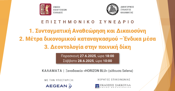 Επιστημονικό Συνέδριο: 1. Συνταγματική Αναθεώρηση και Δικαιοσύνη, 2. Μέτρα δικονομικού καταναγκασμού – Ένδικα μέσα, 3. Δεοντολογία στην ποινική δίκη