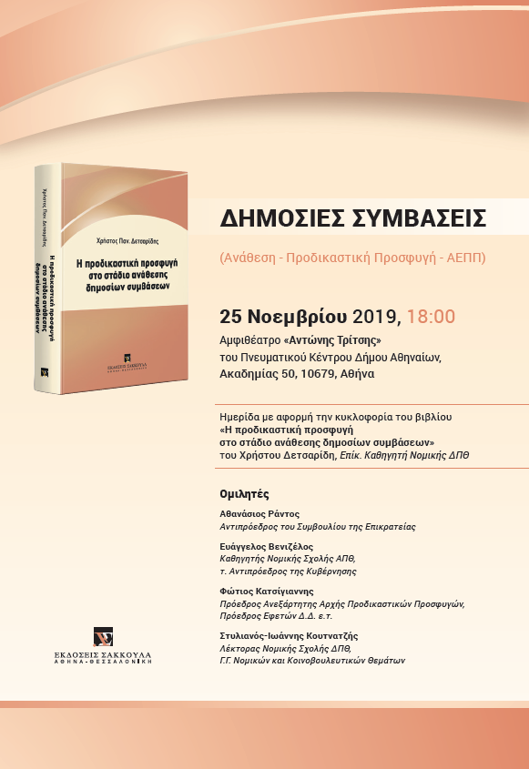 Με αφορμή την έκδοση του βιβλίου του Χρήστου Δετσαρίδη, «Η προδικαστική προσφυγή στο στάδιο ανάθεσης δημοσίων συμβάσεων», οι Εκδόσεις Σάκκουλα ΑΕ σας προσκαλούν στην ημερίδα με θέμα: