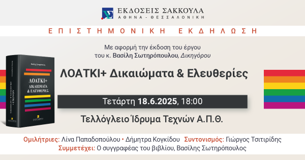 Οι Εκδόσεις Σάκκουλα σας προσκαλούν σε επιστημονική εκδήλωση με αφορμή την έκδοση του έργου του κ. Βασίλη Σωτηρόπουλου, Δικηγόρου με θέμα: