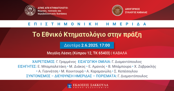 Το Διατμηματικό Πρόγραμμα Μεταπτυχιακών Σπουδών του ΑΠΘ «Κτηματολόγιο: Νομικές, τεχνικές και περιβαλλοντικές διαστάσεις» και οι Εκδόσεις Σάκκουλα Α.Ε. συνδιοργανώνουν ημερίδα με θέμα: