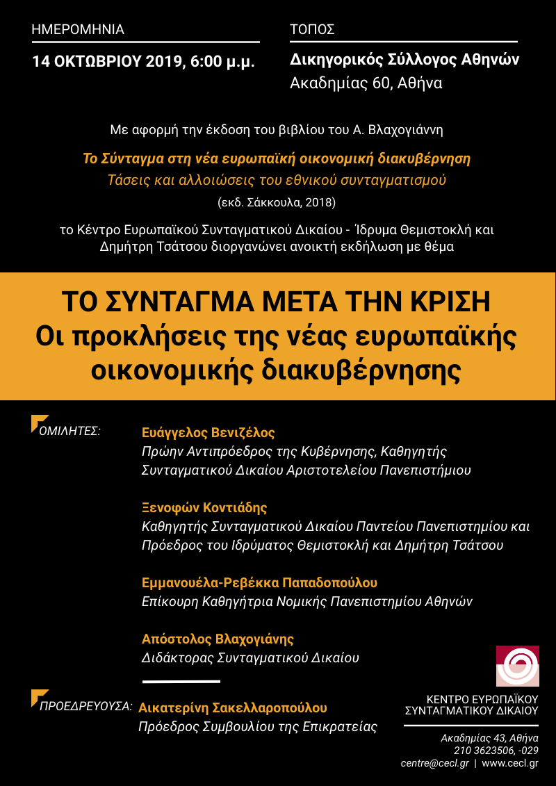 Mε αφορμή την έκδοση του βιβλίου του Α. Βλαχογιάννη «Το Σύνταγμα στη νέα ευρωπαϊκή οικονομική διακυβέρνηση - Τάσεις και αλλοιώσεις του εθνικού συνταγματισμού» (εκδ. Σάκκουλα, 2018)