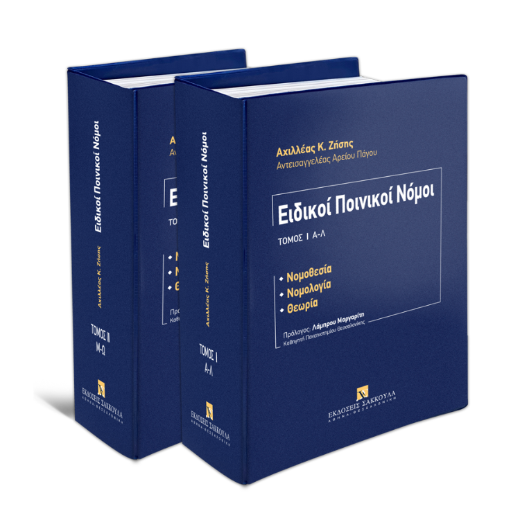 Το απόλυτο εργαλείο μελέτης των Ειδικών Ποινικών Νόμων κυκλοφορεί σε δύο τόμους και συνοδεύεται από τακτικές και πλήρεις ενημερώσεις, σε επίπεδο νομοθεσίας, νομολογίας και θεωρίας. Η παρούσα έκδοση, ενημερωμένη μέχρι και τα μέσα του 2023, παρουσιάζεται πλήρως αναδιαμορφωμένη, με την απαραίτητη αναδιάταξη του υλικού και τη διατήρηση των κινητών φύλλων, που επιτρέπει τις συχνές και πολλαπλές τροποποιήσεις και ενημερώσεις στο κείμενο.
