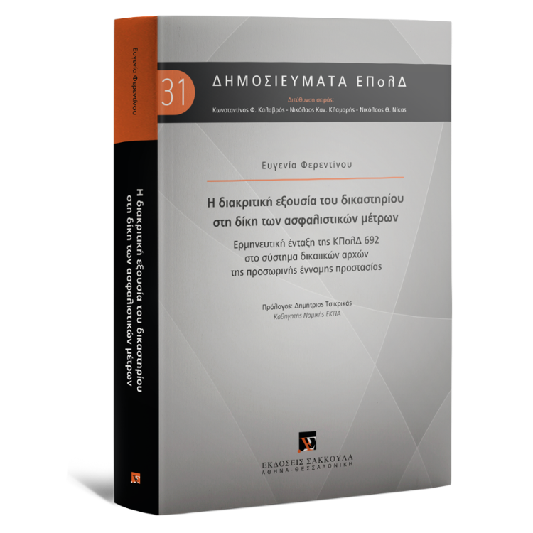 Αντικείμενο της μονογραφίας αποτελεί η διακριτική εξουσία του δικαστηρίου στη δίκη των ασφαλιστικών μέτρων, με άξονα αναφοράς το άρθρο 692 ΚΠολΔ. Με αφετηρία την οριοθέτηση του θεματικού της πεδίου, δηλαδή τη διαδικασία παροχής προσωρινής έννομης προστασίας μέσω γνήσιων ασφαλιστικών μέτρων (5ο βιβλίο ΚΠολΔ), περιγράφονται τα βασικά χαρακτηριστικά της, με έμφαση στο χαρακτηριστικό της αποτελεσματικότητάς της και τον συσχετισμό μεταξύ του είδους του ασφαλιστέου δικαιώματος και των ιδιαίτερων πραγματικών συνθηκών διακινδύνευσής του (κεφάλαιο 1ο). Ακολούθως, προσεγγίζονται οι νομικές βάσεις της υπερνομοθετικής κατοχύρωσης των ασφαλιστικών μέτρων σε εθνικό, ενωσιακό και διεθνές επίπεδο και η αντανάκλασή της στην πληθώρα διατάξεων του ΚΠολΔ που εξειδικεύουν την επιταγή για αποτελεσματικότητα των ασφαλιστικών μέτρων, με δίαυλο τη διακριτική εξουσία του δικαστηρίου (κεφάλαιο 2ο).
