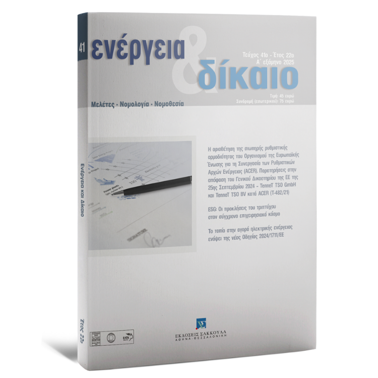 If you wish to subscribe to the journal 'Ενέργεια & Δίκαιο', please contact one of our stores (Athens: +30 210 33 87 500, Thessaloniki: +30 2310 535 381) or send an e-mail to info@sakkoulas.gr