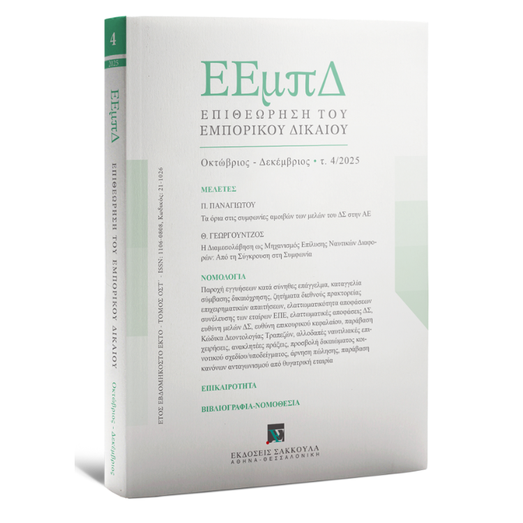 If you wish to subscribe to the journal 'Επιθεώρηση του Εμπορικού Δικαίου', please contact one of our stores (Athens: +30 210 33 87 500, Thessaloniki: +30 2310 535 381) or send an e-mail to info@sakkoulas.gr