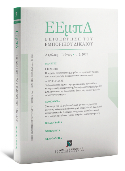 If you wish to subscribe to the journal 'Επιθεώρηση του Εμπορικού Δικαίου', please contact one of our stores (Athens: +30 210 33 87 500, Thessaloniki: +30 2310 535 381) or send an e-mail to info@sakkoulas.gr