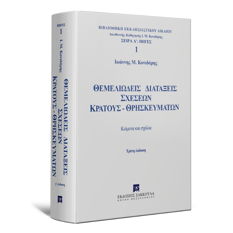 Οι Εκδόσεις Σάκκουλα ΑΕ (Αθήνα-Θεσσαλονίκη) προσφέρουν το έργο Θεμελιώδεις διατάξεις σχέσεων Κράτους-Θρησκευμάτων - Γ' έκδοση στα μέλη της Εταιρείας Εκκλησιαστικού & Κανονικού Δικαίου, στους συνδρομητές της Επιθεωρήσεως Εκκλησιαστικού και Κανονικού Δικαίου ΝΟΜΟΚΑΝΟΝΙΚΑ και στα εκκλησιαστικά νομικά πρόσωπα δημοσίου και ιδιωτικού δικαίου στην ειδική τιμή των 25 €.