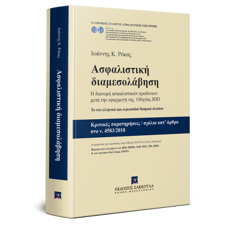 Κυκλοφορεί από τις Eκδόσεις Σάκκουλα A.E. το έργο «Ασφαλιστική διαμεσολάβηση. Η διανομή ασφαλιστικών προϊόντων μετά την εφαρμογή της Οδηγίας IDD» του ομ. Καθηγητή και δικηγόρου κ. Ιωάννη Ρόκα, Προέδρου ε.τ. της Παγκόσμιας Ένωσης Ασφαλιστικού δικαίου. Πρόκειται για επιμελημένη έκδοση του νέου νόμου 4583/2018 για τη διανομή ασφαλιστικών προϊόντων, με κριτικά σχόλια και παρατηρήσεις. Με τη θέση σε ισχύ του νέου νόμου, το ελληνικό δίκαιο μαζί με τα δίκαια των λοιπών Κρατών της Ευρωπαϊκής Ένωσης εναρμονίστηκε με την Οδηγία 2016/97 για τη διανομή ασφαλιστικών προϊόντων, γνωστή ως IDD (Insurance Distribution Directive), και συγχρόνως τέθηκαν σε ισχύ τέσσερις Ευρωπαϊκοί Κανονισμοί, που συμπληρώνουν το ριζικά νέο νομοθετικό περιβάλλον του σημαντικού αυτού κλάδου της Οικονομίας, που στοχεύει πρωταρχικά στη βελτίωση της υπηρεσίας και στην ενίσχυση της προστασίας του καταναλωτή και γενικότερα του δέκτη υπηρεσιών διανομής ασφαλιστικών προϊόντων. Το νέο δίκαιο δεν είναι πλέον απλώς το δίκαιο της ασφαλιστικής διαμεσολάβησης και των επαγγελματιών του κλάδου αυτού, αλλά το δίκαιο που διέπει κάθε διανομέα ασφαλιστικών προϊόντων, έστω και αν η διανομή έγινε από την ίδια την ασφαλιστική επιχείρηση, καθόσον και σε αυτήν την περίπτωση πρέπει ο αγοραστής να προστατεύεται εξίσου και να έχει την ίδια υψηλή ποιότητα υπηρεσίας. Ακόμα, το νέο δίκαιο εξισώνει τον βαθμό προστασίας που απολαμβάνει ο πελάτης επενδυτικής επιχείρησης με εκείνον του πελάτη επενδυτικού προϊόντος που βασίζεται σε ασφάλιση, καλύπτοντας έτσι ένα μεγάλο κενό της ενωσιακής νομοθεσίας.