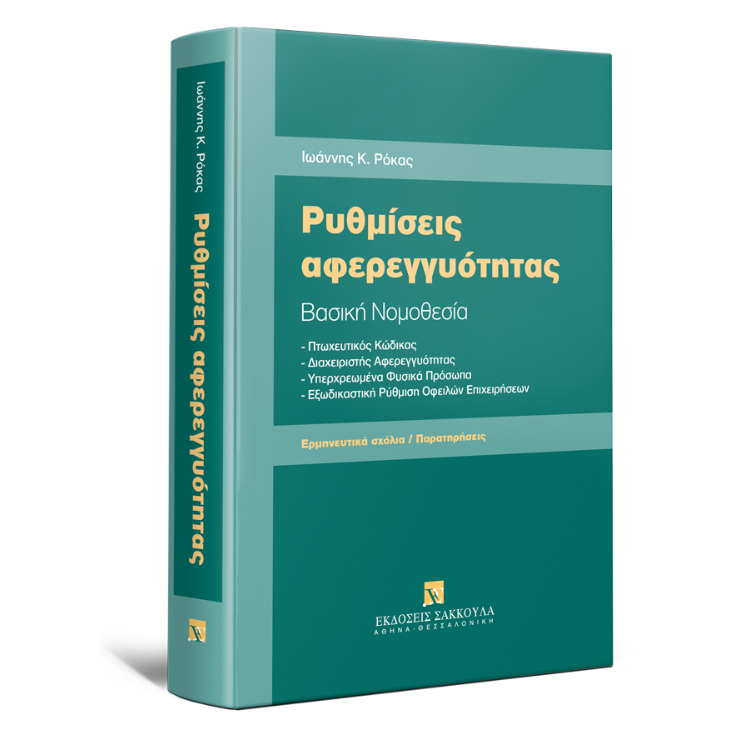 Περιλαμβάνονται: Πτωχευτικός Κώδικας, Διαχειριστής Αφερεγγυότητας, Υπερχρεωμένα Φυσικά Πρόσωπα, Εξωδικαστική Ρύθμιση Οφειλών Επιχειρήσεων.