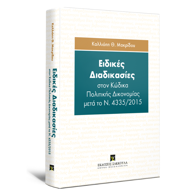 Σκοπός του βιβλίου είναι τόσο η συστηματική και ολοκληρωμένη παρουσίαση των «νέων» ειδικών διαδικασιών, όσο και η εξέταση προβληματικών και αμφισβητούμενων σημείων του νέου νόμου που βέβαιο είναι ότι η θεωρία και η πράξη θα αντιμετωπίσουν προσεχώς. Οι ερμηνευτικές λύσεις που προτείνονται θα υποστηρίξουν το έργο δικαστών και δικηγόρων κατά την εφαρμογή του ν. 4335/2015.