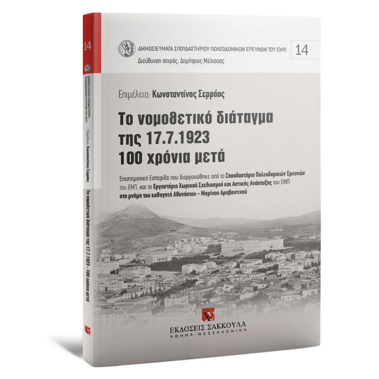 Το παρόν έργο περιέχει τα πρακτικά Επιστημονικής Εσπερίδας με τίτλο «Το Νομοθετικό Διάταγμα της 17.7.1923 – 100 Χρόνια Μετά», η οποία διεξήχθη τον Οκτώβριο του 2023 και αποτελεί επιστημονική συνεισφορά στη συζήτηση που αναπτύσσεται από ποικίλους ακαδημαϊκούς και ειδικούς επιστήμονες αναφορικά με τη συμβολή του νομοθετικού διατάγματος της 17ης.7.1923 «Περί σχεδίων πόλεων, κωμών και συνοικισμών του Κράτους και οικοδομής αυτών» στην εξέλιξη της πολεοδομικής νομοθεσίας στη χώρα μας κατά τη διάρκεια ενός αιώνα.