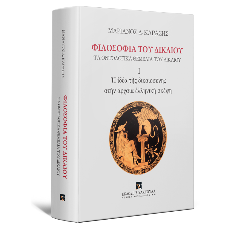 H αρχαία ελληνική σκέψη παραμένει θεμελιώδης ως αφετηρία για πολλά από τα σύγχρονα προβλήματα και στο πεδίο της Φιλοσοφίας του Δικαίου. Το προκείμενο έργο παρακολουθεί ορισμένες από τις πιο καθοριστικές πτυχές της αρχαιοελληνικής γιγαντομαχίας για το «Είναι». Εδώ ανάγονται τα οντολογικά θεμέλια του Δικαίου. Με ποικίλλουσα ένταση και έκταση παρουσιάζεται ο πρωτοπόρος και γονιμοποιός λόγος των προσωκρατικών φιλοσόφων και οι καταβολές του, όπου η δικαιοσύνη συλλαμβάνεται είτε ως αναλογική ανταπόδοση («αντιπεπονθός») είτε διαλεκτικώς, θεμελιούμενη στην διαλεκτική αρμονία των αντιθέτων· των σοφιστών, που συνέδεσαν το πρόβλημα της δικαιοσύνης με την θεμελιακή διάκριση θετικού και φυσικού δικαίου· των τραγικών, όπου ως υπαρξιακή αρχή γεννήθηκε η «ποιητική δικαιοσύνη»· προπάντων του Πλάτωνος, που κατέστησε την ιδέα της δικαιοσύνης πυρήνα των πολιτικών διαλόγων του, της Πολιτείας, του Πολιτικού και των Νόμων· και, τέλος, του Αριστοτέλους, όπου η δικαιοσύνη αποτελεί κεντρική έννοια της πρακτικής του φιλοσοφίας και αναλύεται στα δύο μέρη αυτής, στα Ηθικά (Ηθικά Μεγάλα, Ηθικά Ευδήμεια και, ιδίως, Ηθικά Νικομάχεια) και τα Πολιτικά. Το κείμενο μοιράζεται με τον αναγνώστη, τον Νομικό, αλλά και όχι μόνο, την φλόγα και την γοητεία του αρχαιοελληνικού Λόγου, την απαραμείωτη στους αιώνες.