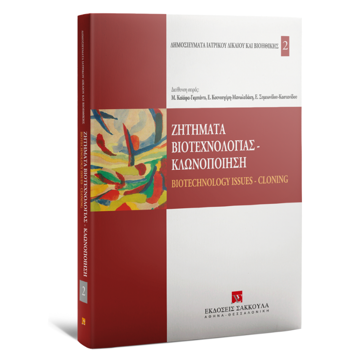 Στο δεύτερο αυτό τεύχος της σειράς «Δημοσιεύματα Ιατρικού Δικαίου και Βιοηθικής» δημοσιεύονται, όπως παρουσιάστηκαν, οι εισηγήσεις της εκδήλωσης που συνδιοργάνωσαν η Επιτροπή Βιοηθικής και Δικαίου της ESHRE, το Δίκτυο του ΑΠΘ «Σύγχρονη Ιατρική Πράξη, Βιοϊατρική και Δίκαιο» και ο Όμιλος Μελέτης Ιατρικού Δικαίου και Βιοηθικής, με θέμα: «Ζητήματα Βιοτεχνολογίας – Κλωνοποίηση».