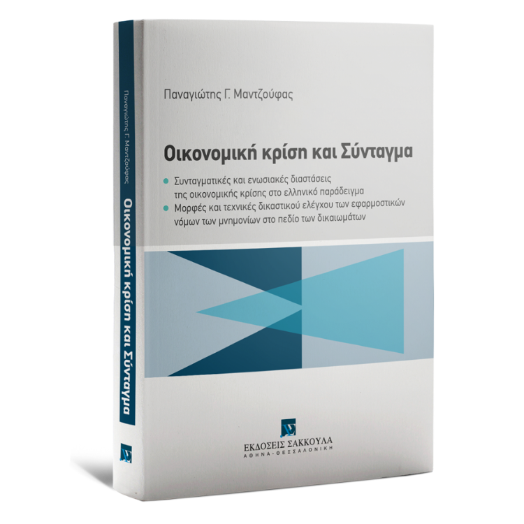 Στην παρούσα μονογραφία του επ.καθηγητή Π.Μαντζούφα αναλύονται οι επιπτώσεις της οικονομικής κρίσης στην λειτουργία των θεσμών του ελληνικού κράτους και ειδικότερα του Συντάγματος. Στο πρώτο μέρος, μετά από μια αναλυτική εισαγωγή όπου τίθενται οι βάσεις του προβληματισμού και οι βασικές υποθέσεις εργασίας, παρουσιάζεται η ενωσιακή διάσταση της κρίσης και κυρίως οι θεσμικές υπερβάσεις που πραγματοποίησαν τα όργανα της ΕΕ προκειμένου να αντιμετωπίσουν και να περιορίσουν τις επιπτώσεις της ενώ προηγουμένως περιγράφεται συνοπτικά πως η Ελλάδα οδηγήθηκε σε ένα δημοσιονομικό αδιέξοδο και ενώπιον μιας χρεοκοπίας.
