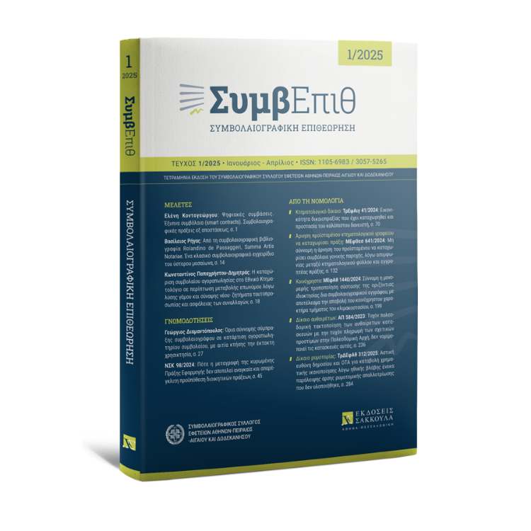 Κωνσταντίνος Παπαχρήστου-Δημητράς: Η καταχώριση συμβολαίου αγοραπωλησίας στο Εθνικό Κτηματολόγιο σε περίπτωση μεταβολής επωνύμου λόγω λύσης γάμου και σύναψης νέου· ζητήματα ταυτοπροσωπίας και ασφάλειας των συναλλαγών, σ. 18