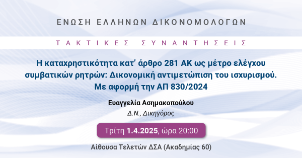 | 20:05 – 20:40 | Εισήγηση Ευαγγελίας Ασημακοπούλου, Δ.Ν., Δικηγόρου Η καταχρηστικότητα κατ’ άρθρο 281 ΑΚ ως μέτρο ελέγχου συμβατικών ρητρών: Δικονομική αντιμετώπιση του ισχυρισμού. Με αφορμή την ΑΠ 830/2024 |